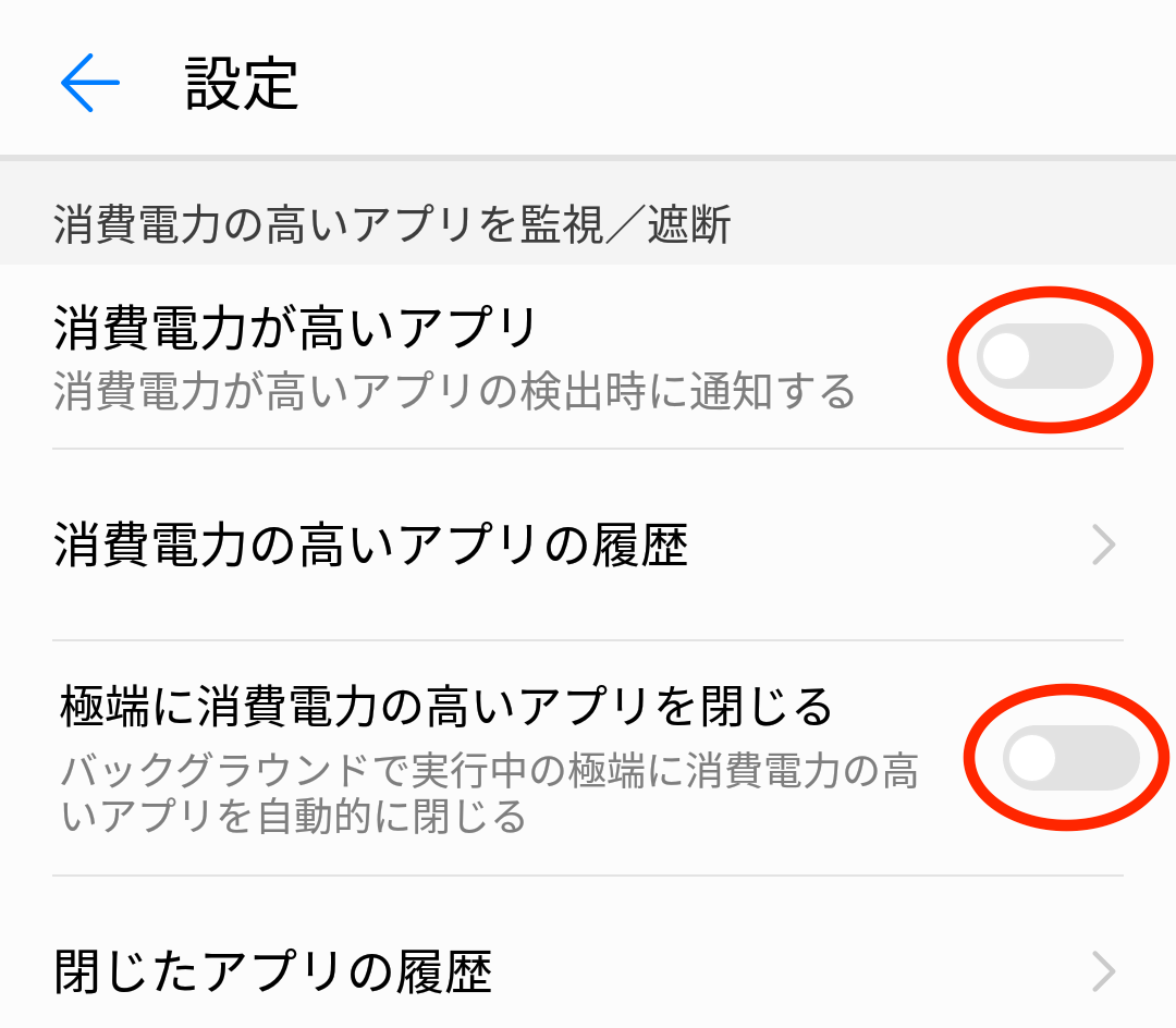 - 極端に消費電力が高いアプリを閉じるをオフにしてください